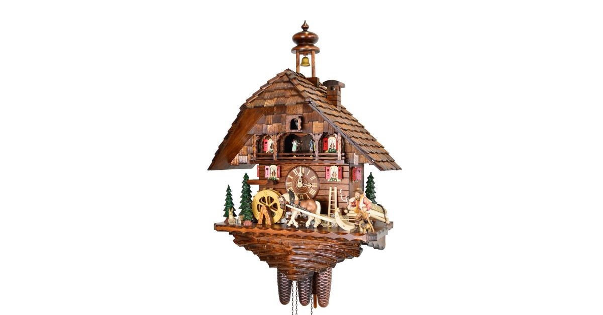 The cuckoo calls every half hour once and the number of the hours every full hour. With certificate of authenticity from the Black Forest Clock Association (VdS). It has a mechanical extreme long-life rack strike movement. The 8 days running time movement need to be wind up once a week, that means you pull on the chains until the weights are up. It allows turning the hands left and right without endangering the mechanics of the movement. The music box is from the marketleader REUGE in switzerland. The size refers only to the clock, without pendulum and weights.