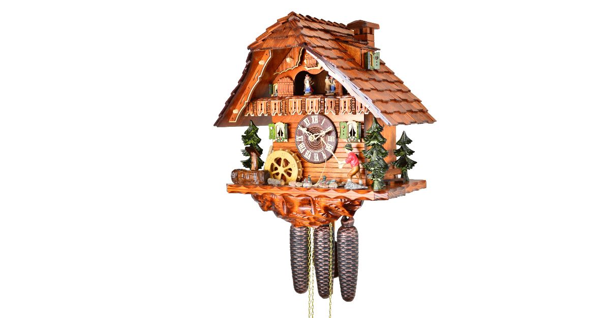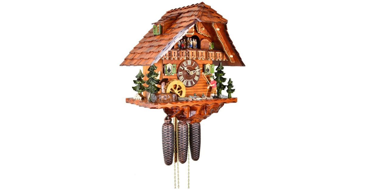 The Cuckoo Clock Black Forest house has a moving fisherman and mill wheel that moves along with the music. It's an 8-day movement clock that features a fishing village in the Black Forest. The cuckoo calls every full hour and half hour. Made in Germany.