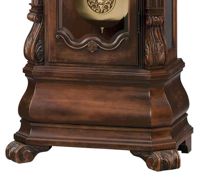 The Howard Miller Hamlin, an heirloom-style larger floor clock with a distressed finish, was designed by Chris Bergelin. The Hamlin offers a carved shell and leaf design that draws the eye up to the arched pediment, which is embellished with decorative overlays on the canted corners.
