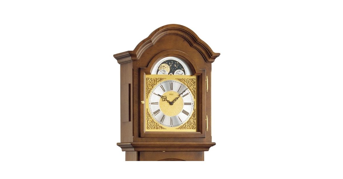 Kieninger Grandmother Clock with Westminster Chimes and 8-Day Power Reserve in Antique Walnut is a classic, more elegant English style grandmother clock with a narrow waist and more delicate proportions.