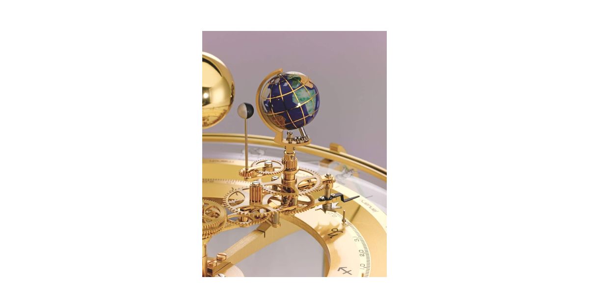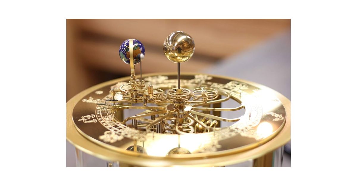 The Tellurium clock reproduces the annual orbit of the earth around the sun, with the earth rotating around its own axis once in 24 hours.