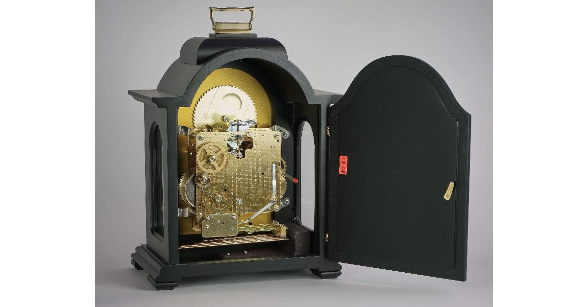 Shouldered arch mantle clock in an elaborate walnut finish wood case with pyramid mahogany veneer.