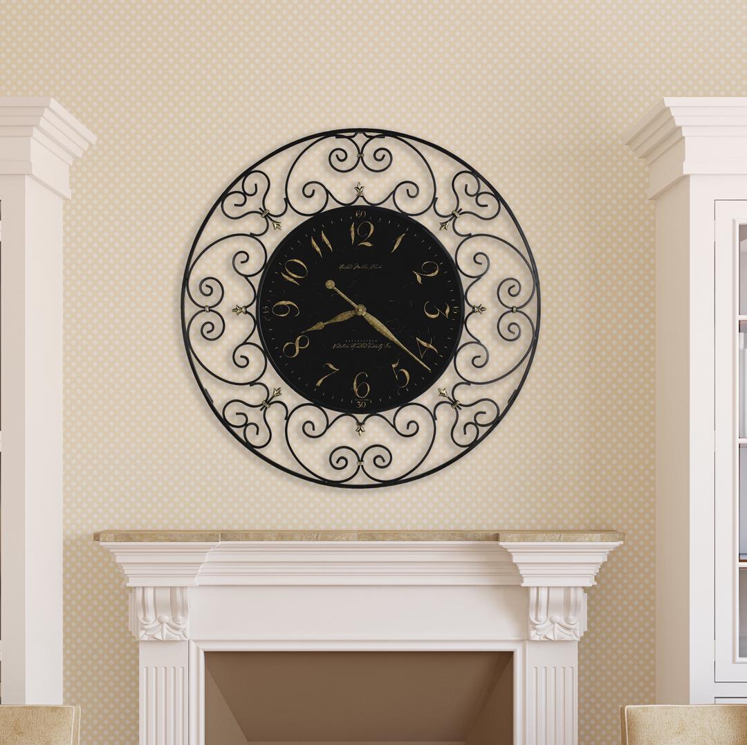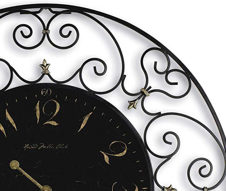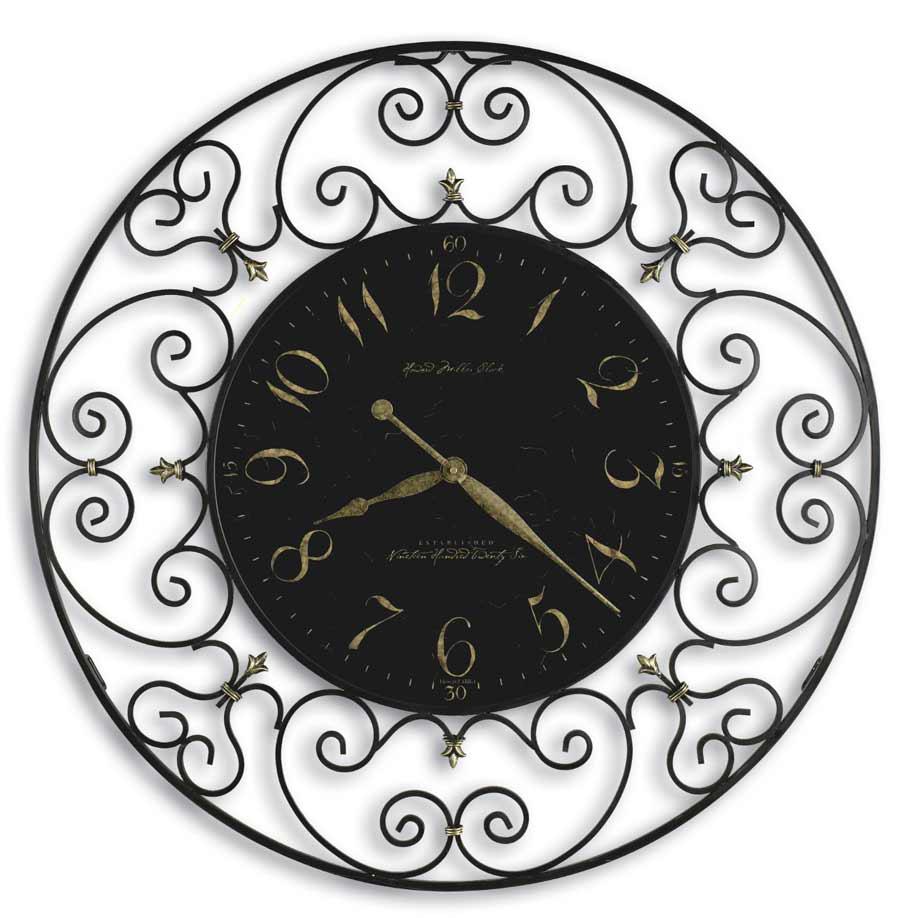 This impressive 36 inch diameter black iron wall clock features decorative scroll work and a cast fleur de lis, finished with gold-tone highlights.
